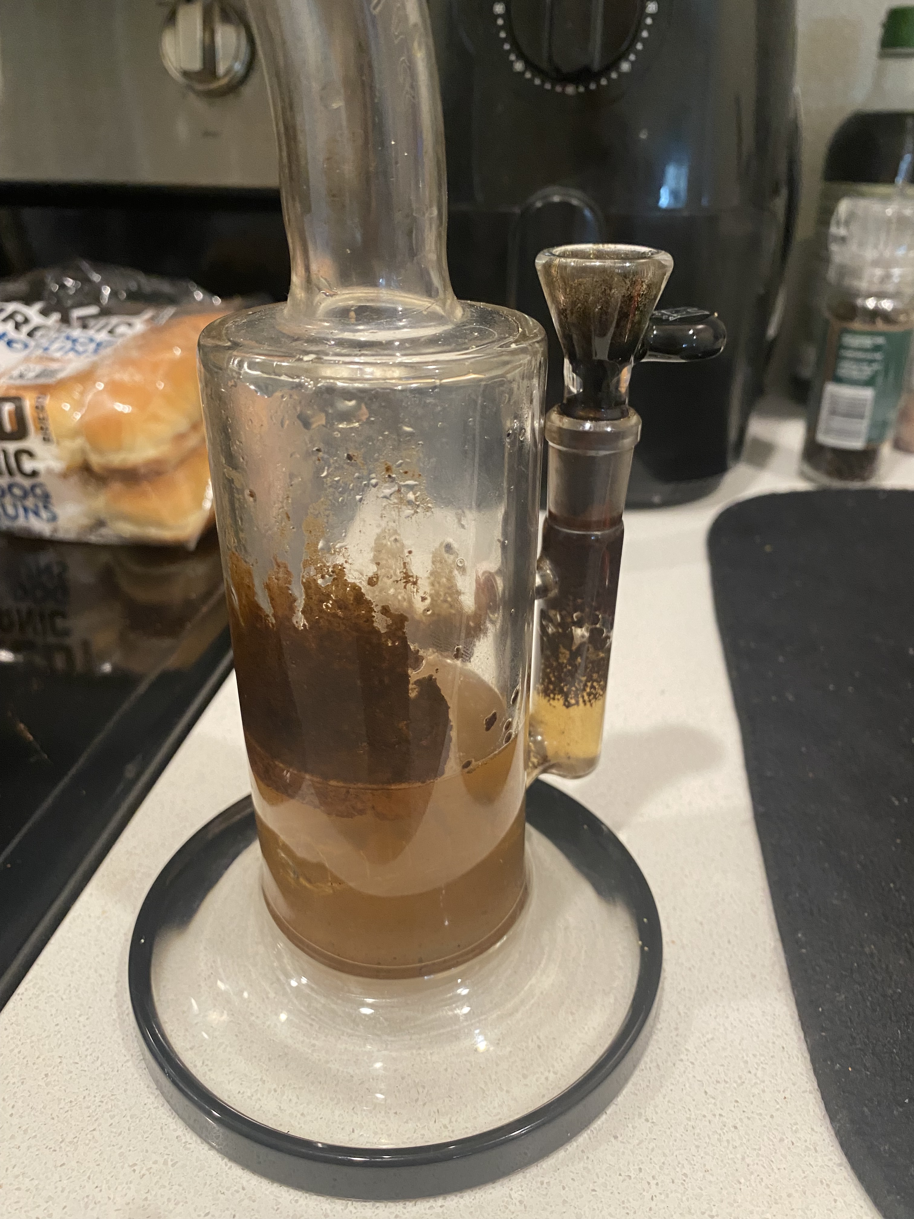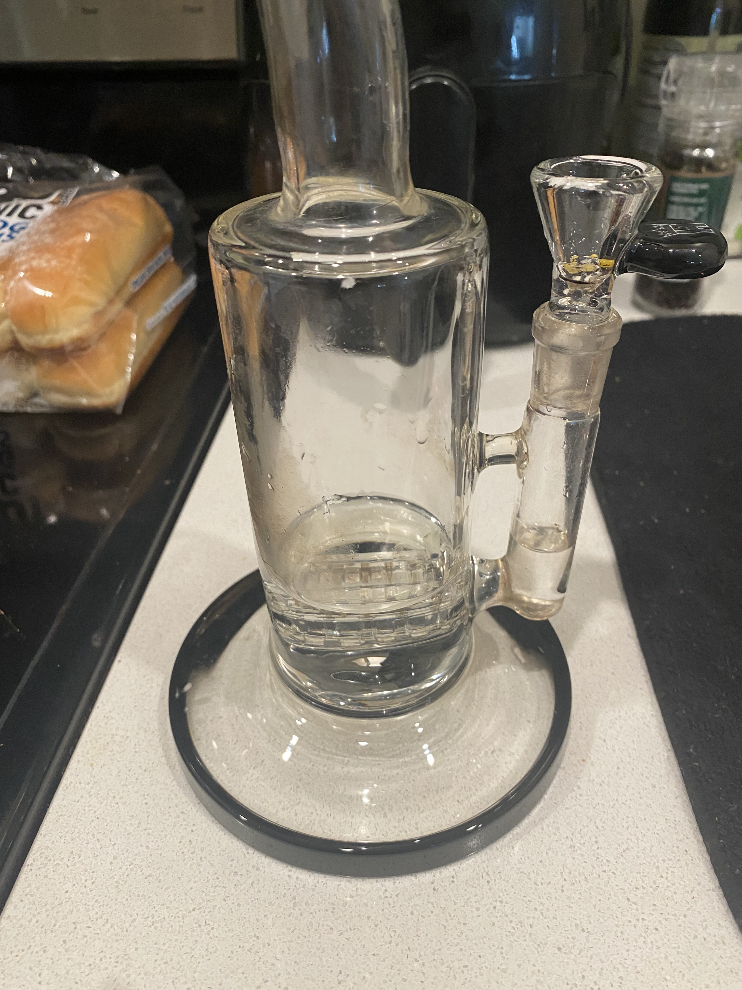 I put the stem in a baggie with hot water, isopropyl alcohol (must be 91%) and salt. I shake it till it gets clean. Usually take a few minutes. For the larger piece, I pour hot water and isopropyl alcohol in it and add the salt, I then shake it like crazy until it’s clean. Then it’s just a rinse to get the alcohol or any other residue off of the glass piece. The alcohol prep pads help soak the residue off of the sides and I use an extra to clean any sticky residue off of the outside of the glass piece.