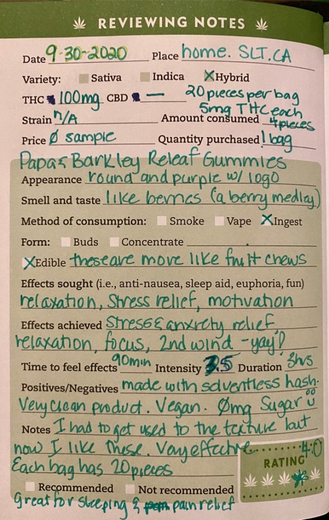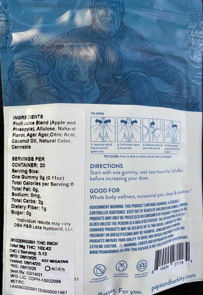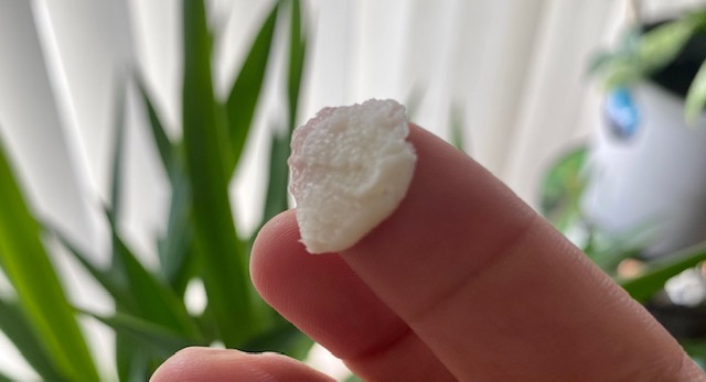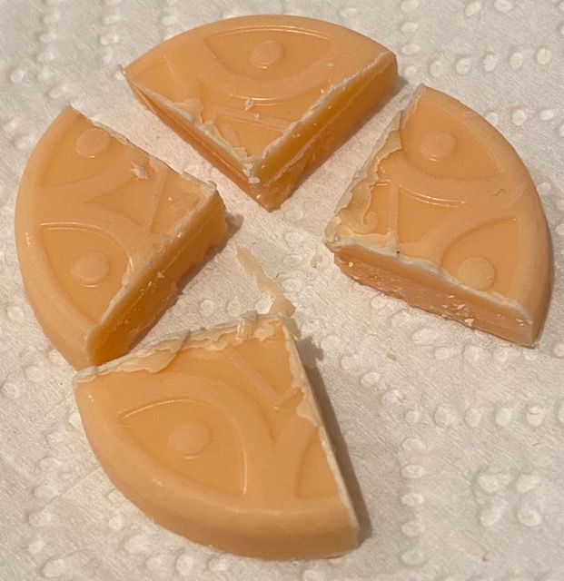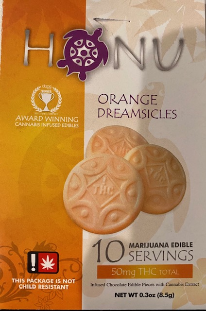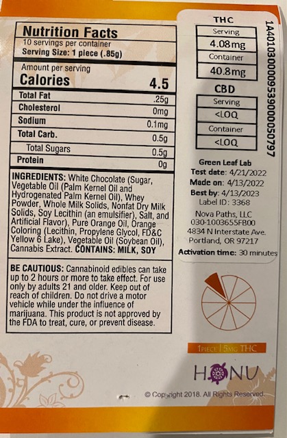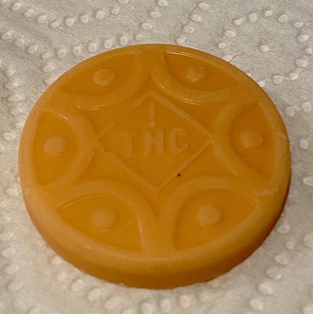 One thing I have noticed about edibles in Oregon is that most come as one big piece that you have to cut up individually. Like these – there is a picture as an example but to cut this into smaller pieces would be really messy and a little difficult. I just cut them into quarters. The taste reminded me of an orange creamsicle popsicle.