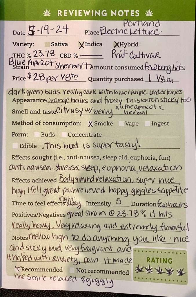 It’s been hard to find really sticky bud in Oregon. This one was not super dry and to my surprise, a little sticky as well. I have been liking the strains I have been getting from this cultivar. The Peanut Butter Pie was not only super tasty but gave me my muscles the relaxation they needed. My anxiety and stress melted away shortly after my first bong hit.