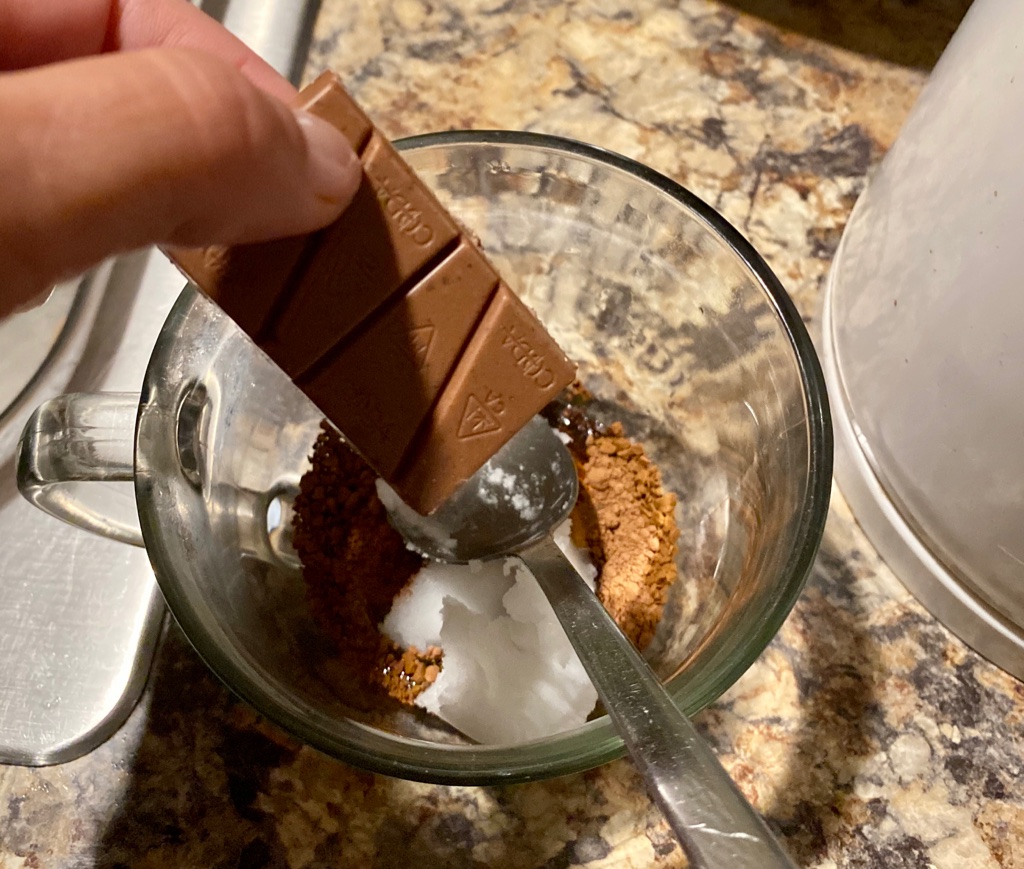 I love to break my chocolate bar into pieces and blend them into my coffee. See below.
