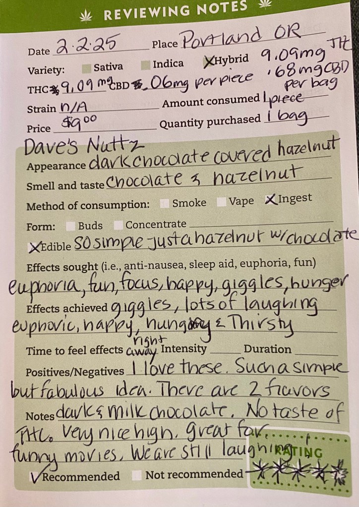 I was so excited when I saw these at the dispensary. I don’t necessarily love hazelnuts but these are a completely different story. They are so tasty and the chocolate/hazelnut combo reminds of Toffifay candy, my mom used to eat those all the time.