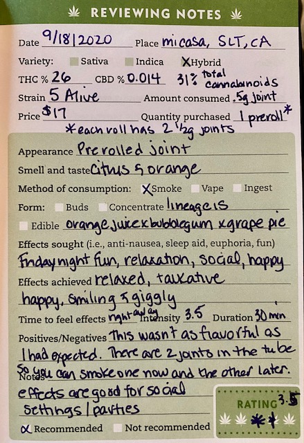 My reviews: 5 Alive preroll September 19, 2020Posted in Cannabis, LifeTagged Cannabis, giggles, limonene, Prerolls, sativaLeave a comment