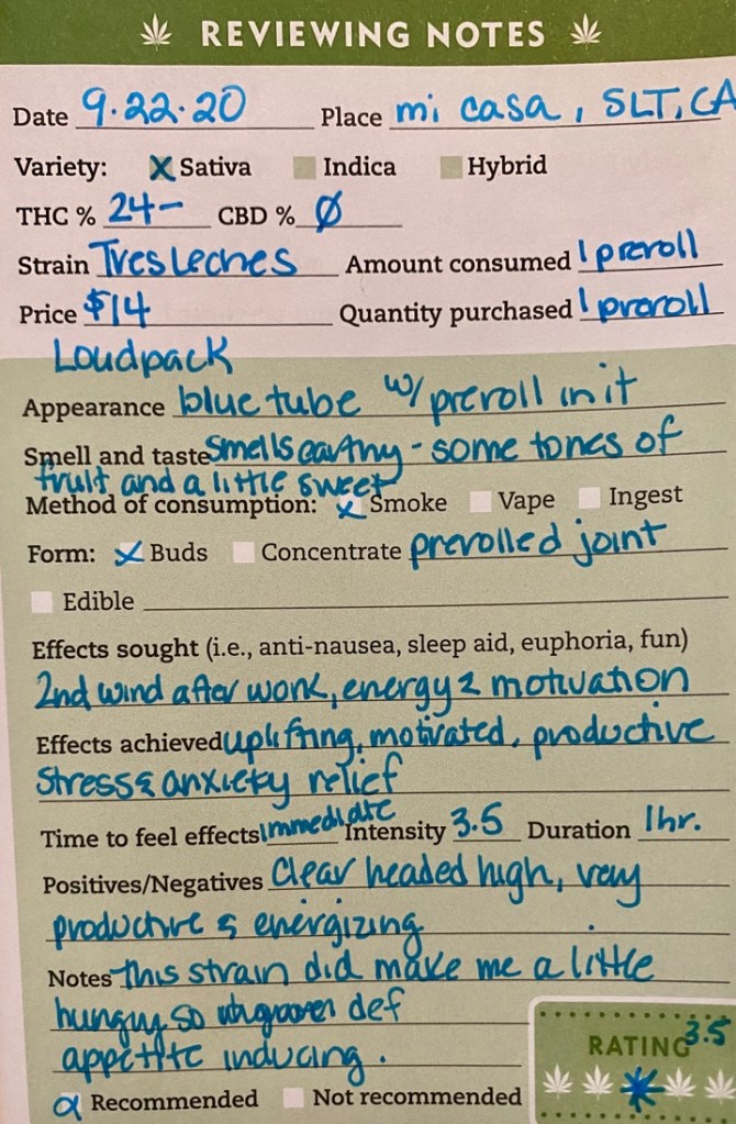 My reviews: Tres Leches Preroll by Loudpack September 23, 2020September 22, 2020Posted in Cannabis, LifeTagged Cannabis, energy, loudpack, motivation, Prerolls, sativa, treslechesLeave a comment My opinion only here. Thanks for checking it out.
